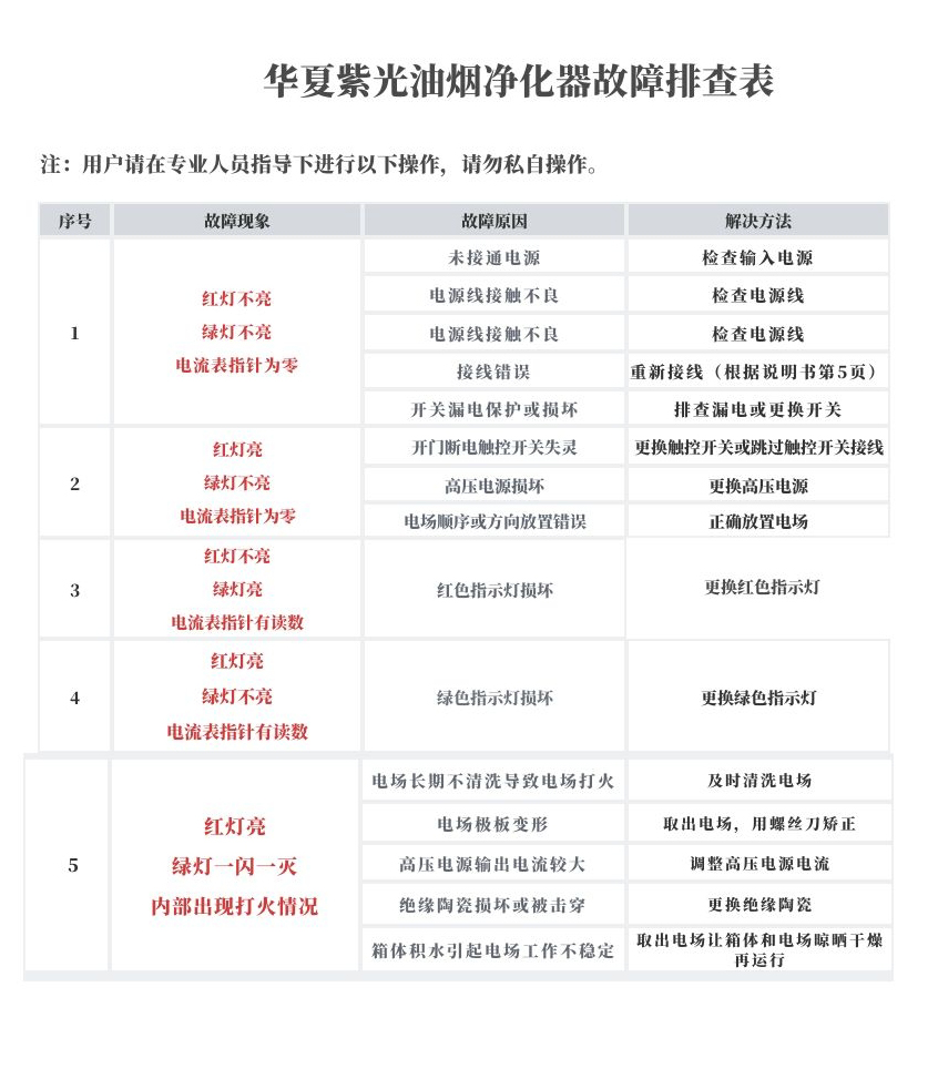 廚房油煙凈化器作為如今餐飲單位必備的廚房油煙凈化裝置,很多飯店老板在安裝購(gòu)買使用油煙凈化器時(shí)不清楚油煙凈化器出現(xiàn)故障是什么原因,接下來(lái)有小編簡(jiǎn)單梳理一下油煙凈化器常見(jiàn)故障及排除方法。1、油煙凈化器紅燈亮,綠燈一閃一閃時(shí)油煙凈化器在使用過(guò)程中綠色指示燈